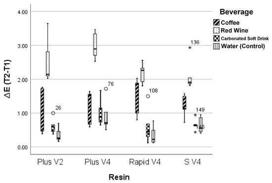Boxplots of ΔE (T2–T1) according to Villacryl resin and beverage category after immersion in the beverages (°, * represents outliers).