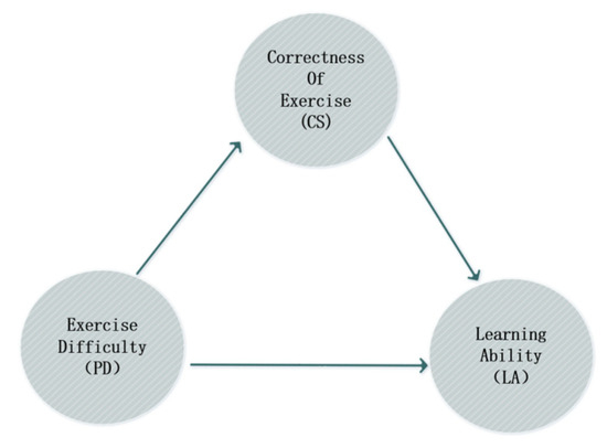 - Calculating students’ learning ability and the difficulty of exercises: Students with different learning abilities have varying preferences for answering questions. Students with stronger learning abilities tend to prefer more relatively difficult questions, which may result in a lower accuracy rate. However, we should not underestimate their learning potential because of this. Similarly, students with lower learning abilities may also have a low accuracy rate on simple exercises, and we cannot therefore overestimate the difficulty of the question. To more accurately assess students’ learning abilities and the difficulty of exercises, we constructed a prior causal model for learning ability and exercise difficulty. Initially, we assumed that all students had the same level of learning ability. When identifying students’ abilities, we considered exercise difficulty as the confounding factor, and when identifying exercise difficulty, we treated students’ abilities as the confounding factor. We employed backdoor adjustment to eliminate the influence of these confounding factors.