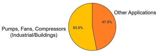 According to statistical data, electric motors and motor systems in industrial and infrastructure applications with pumps, fans, and compressors in buildings are responsible for 53% of the world’s total electricity consumption [13] (Figure 1). This underscores the significant role of IMs as the most widely used type of electric machine in the industrial sector.