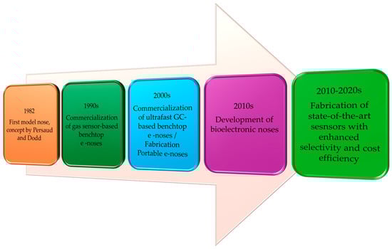 In the 1980s, research on machine olfaction led to the accepted definition of e-nose as a device with a variety of electrochemical gas sensors with partial specificity and a pattern recognition system [7]. In order to meet practical needs, an e-nose using nanomaterials was developed, which was inspired by the mammalian sense of smell [72], standing out as a promising biomimetic device [73,74,75]. Its original design goal was to capture specific odor molecules in the air to enable the recognition of various gases. Importantly, e-nose technology has developed very rapidly over the last thirty years [76,77,78,79,80]. The e-nose concept has gone from its original form to the development of materials and identification methods. Activities related to the commercialization of e-noses have forced efforts to reduce their costs and to give the expanded stationary devices smaller dimensions, which would allow for their mobile use, e.g., in plantations or processing plant conditions. These devices are cost-effective, portable, easy to operate, and above all, allow for rapid analysis [7,81]. The stages of e-nose evolution are presented in Figure 1. Examples of e-nose use in food quality assessment and the obtained results are presented in Table 1.