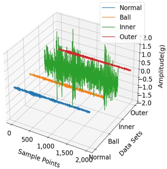 Figure 4. Voltage signals under normal, ball fault, inner-race fault, and outer-race fault states.