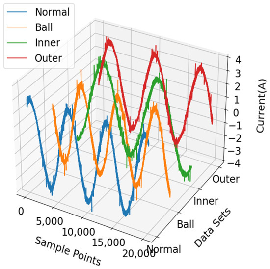 Figure 5. Current signals under normal, ball fault, inner-race fault, and outer-race fault states.