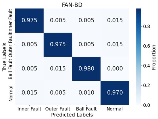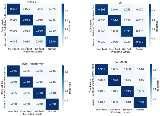 To demonstrate each parameter, confusion matrices were created, as shown in Figure 8, based on the results of the five algorithms used in the testing sets. The accuracy derived from the confusion matrices for the four algorithms is as follows: CBMA-ViT (Accuracy = 0.929), ViT (Accuracy = 0.907), Swin Transformer (Accuracy = 0.931), and ConvNeXt (Accuracy = 0.915). These results highlight the superior performance of the proposed FAN-BD algorithm compared to the other models. As seen in Table 4, the FAN-BD excels in terms of precision, recall, and F1 score, demonstrating the algorithm’s ability to effectively balance both the detection and classification of faults, ensuring high accuracy and reliability.