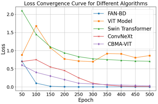 To verify the feasibility of the proposed FAN-BD algorithm, we compared it with mainstream algorithms, including CBMA-ViT, ViT, Swin Transformer, and ConvNeXt. The cross-entropy loss function was used to optimize the classification accuracy, chosen for its ability to effectively measure the difference between predicted probabilities and actual labels. A comparative analysis of accuracy and loss across multiple iterations highlights the superior performance of FAN-BD, as illustrated in Figure 9.