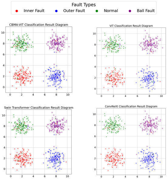 Figure 10 visualizes the classification results of CBMA-ViT, ViT, Swin Transformer, and ConvNeXt when using the testing sets by mapping them into a two-dimensional space using t-SNE. Each subplot in Figure 10 corresponds to one algorithm, allowing for a direct comparison of their performance with the FAN-BD results shown in Figure 7. The t-SNE algorithm reduces the dimensionality of the data, enabling an intuitive observation of the classification results through the color and position of the points. As shown in the figure, FAN-BD achieved the highest accuracy, with fewer than ten misclassifications of six hundred samples. In contrast, CBMA-ViT and ConvNeXt misclassified more than thirty points, while both the ViT model and Swin Transformer misclassified at least fifty points each. This highlights the superior performance of FAN-BD compared to the other algorithms.