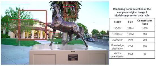 Figure 7 is a visualization of the ablation experiment of the main process modules. The dataset used is the Horse sub-dataset of Tanks & Temples. We use red boxes to frame two local areas on the complete original image and zoom in on the two areas in the renderings at different stages of the training process. We use the size of the 3DGS model as a benchmark. Our method compresses to 65% at the 15,000th iteration, 25% at the 30,000th iteration, 15% after knowledge distillation, and 5% after vector quantization. From the first group of images, we can see that after the model is compressed when rendering areas with dense changes such as leaves, the edges have obvious degradation. We further zoom in on the image, and from the second group of images, we can see that obvious degradation has occurred in the high-frequency texture area of the leaves. In addition, we can find that in the first 30,000 iterations, the main changes occur in the morphology of the Gaussian points. In the knowledge distillation and vector quantization stages, the main changes occur in the color attributes of the Gaussian points.