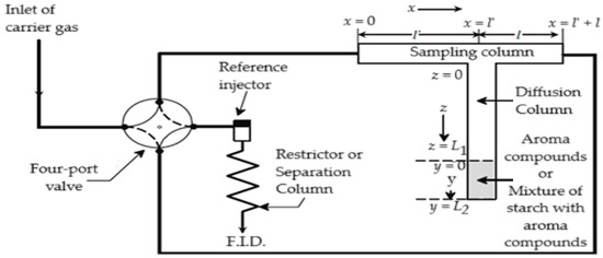 In this study, reversed-flow gas chromatography (RF-GC), an IGC sub-technique, is used for the first time to study the mechanisms of the release and evaporation of aroma compounds both from bulk liquid and from different starches. This technique was introduced in 1980 [42], and it has since been used in a wide range of scientific fields, including the calculation of adsorption isotherms [43], the kinetic study of alcoholic fermentation [44,45,46,47], the analysis of interactions between aroma compounds and starch [48], the determination of diffusion and mass transfer coefficients [49,50,51], and more.