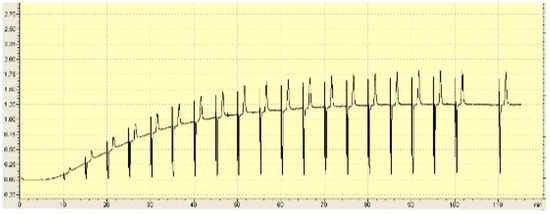 By the time a concentration–time curve—referred to the evaporated aroma compound—appeared, the flow of the carrier gas was inversed in order to begin the chromatographic procedure. The flow reversal lasted for 6 s, a period of time shorter than the gas hold-up time in both sections of the sampling column. By applying the above procedure, a sequence of sampling peaks was obtained (cf. Figure 2).