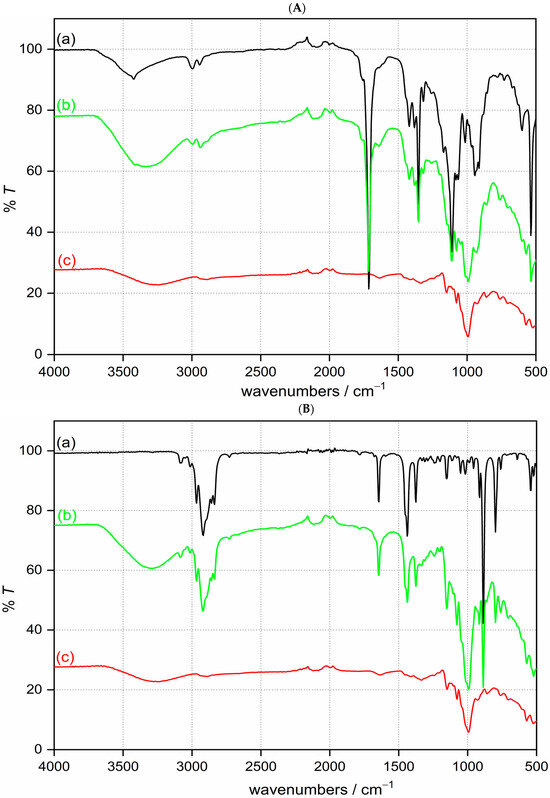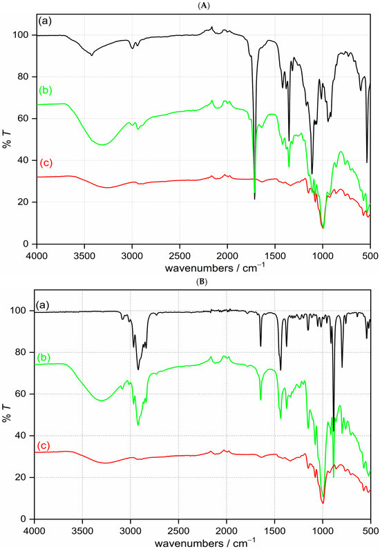 FTIR spectra of (A) (a) diacetyl, (b) potato starch + diacetyl mixture, and (c) potato starch, as well as (B) (a) dl-limonene, (b) potato starch + dl-limonene mixture, and (c) potato starch.
