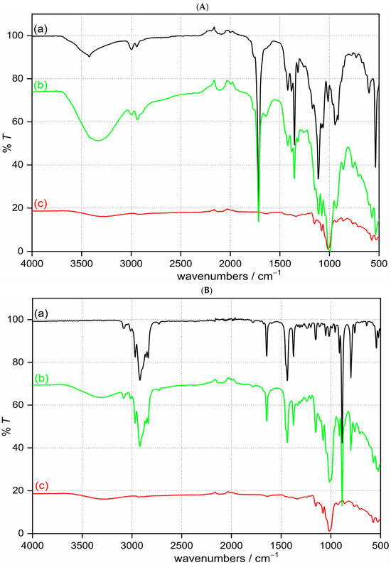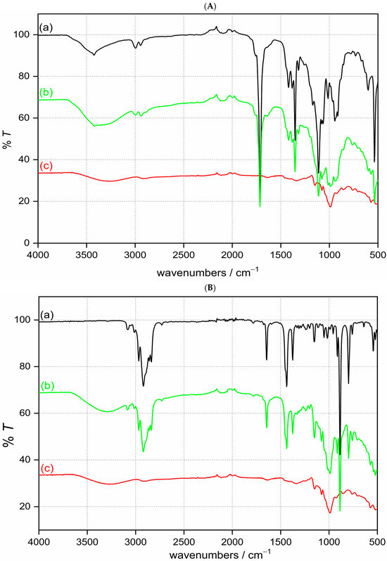 FTIR spectra of (A) (a) diacetyl, (b) wheat starch + diacetyl mixture, and (c) wheat starch, as well as (B) (a) dl-limonene, (b) wheat starch + dl-limonene mixture, and (c) wheat starch.