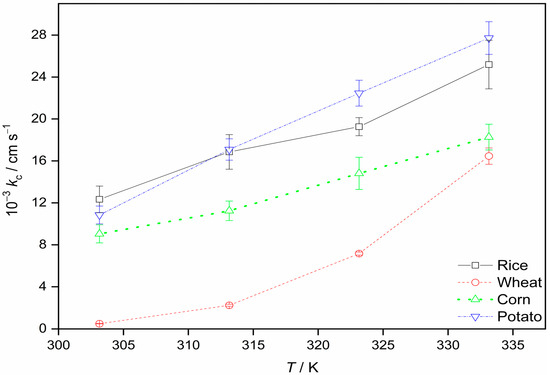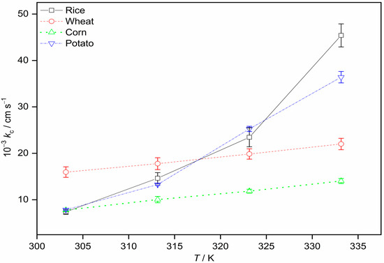 - The values of kc increased with the temperature in all cases. These values are in accordance with the results given in the literature [55] for the mass transfer coefficient of diacetyl from stirred water. Although the values of kc increased with the temperature in each system, comparing the values of two aroma compounds with the same starch at the same temperature does not show a pattern. In the case of the systems aroma compounds and wheat, the kc values are statistically different for the two aroma compounds at all temperatures, while in the case of the systems aroma compounds and corn, the kc values are statistically different only at the highest temperature. This may also explain the small difference observed in the activation energy for the two systems (diacetyl + corn and dl-limonene + corn).