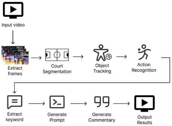 Furthermore, integrating these single techniques into one and building it into a system is required. This study allows us to recognize the court, player actions and tracking, and game events and generate according sentences based on generative AI to make it possible for an AI to broadcast a sports game. To extract the features from each frame in a video and match them for panorama image shift, the SIFT (Scale-Invariant Feature Transform) algorithm is applied, and the homography is generated with panoramic images and is combined with the videos from multi-view cameras in a local view [5]. Furthermore, for court recognition, segmentation based on the YOLO model is applied. Player action and ball detection is performed through YOLO algorithms. YOLO integrates techniques such as dynamic anchor assignment and adaptive task prioritization to improve its architecture, enhance accuracy, and achieve faster inference speeds [6,7]. For object tracking, we propose the following algorithm: In each frame, the YOLO detection model is used to identify the bounding boxes of players. Subsequently, the Intersection over Union (IoU) is calculated between the bounding boxes from the current frame and those from the previous five frames. The bounding boxes with the highest IoU are then linked together to track the movement paths of the players. In recognizing players in a game, since there are multiple teams in a game, team colors, the number of players and referees, and the layout of the court are saved and used in domain knowledge. Finally, based on the information extracted from the video, the ChatGPT-4.0 Turbo API was used to generate a sports broadcast.