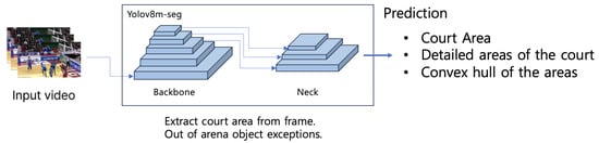 Figure 2 shows the process of court calibration. To calibrate the court, the whole information about the court is required. Our study developed the model to generate a bird’s-eye view of global court images with the following method. First, generate panoramic images from the clips that contain the court region in a video. Second, shift the channel of the image into a YCrCb channel and generate a histogram of the image. Third, limit the color of the image based on the mode color of the image and shift it into a binary image. The region of the court is represented as the biggest contour in the middle of the binary image. The model calculates the convex hull of this region and clusters each degree of the convex hull clockwise. After that, PCA is applied to the clustered result to represent straight lines. The points where different lines cross represent the vertices of the court. Each coordinate of the vertices is used to calculate the homography between the result and the actual court. Through this method, homography can be obtained from a sports clip. Some unstable courts in clips are replaced with the most accurate homography among clips. Finally, the total homography is calculated for the whole video, which allows a bird’s-eye view of the court to be formed. After that, to detect the partial field of the court according to the movement of the screen, the YOLO8-seg model distinguishes the court region, three-point line, paint area, center circle, and outside of the court. Fine-tuning was applied for better performance. A total of 1362 pieces of image data were used for training from the segmentation dataset [20], 1342 for the basketball court, 1296 for the three-point line, 776 for the paint area under the goal post, and 507 for the center circle, with each labeled. Fine-tuning was performed with 300 epochs with 16 batch sizes for the model update. Detailed areas of the court and its convex hull were calculated in order to detect each player’s position on the court and exclude off-court players.