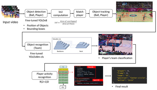 As shown in Figure 1, our study is focused on developing AI-based sports broadcasting. First, the model obtains background knowledge required for the game. The background knowledge contains the layout of the court, type of game, number of players, number of referees, player numbers, team names, team colors, and rules of the game. Secondly, the model derives homography from real-time videos by tracking relative positions on court. It extracts features from frames and the applied SIFT (Scale-Invariant Feature Transform) algorithm to match frames during panoramic image shift. SIFT (Scale-Invariant Feature Transform) is an algorithm used to detect and represent significant local features in an image, providing feature extraction that is invariant to scale and rotation. This algorithm identifies key points in the image and generates local descriptors around each key point, enabling tasks such as object matching, image stitching, and object recognition [5]. The position of the camera for broadcasting the main stream of the game is located and rotates in a fixed position for the game. Our model changes the view of the court into a bird’s-eye view based on the camera calibration result. For this, with OpenCV, it detects the court by shifting parts of the videos frames into panoramic images, and calculates the error with the actual court size. It then calculates the homography of the actual court size to produce bird’s-eye view images. To generate the bird’s-eye view image, the left and right videos covering the entire area were utilized, allowing the panorama to be created with a minimal number of images. Third, the model detects and tracks players with the YOLO model. The YOLO8-cls model is fine-tuned to extract the court domain and player positions, allowing detection of the players and the ball in real time. For object tracking, we propose the following algorithm to optimize the system performance. In each frame, the YOLO detection model is used to identify the bounding boxes of players. Subsequently, the Intersection over Union (IoU) is calculated between the bounding boxes from the current frame and those from the previous five frames. The bounding boxes with the highest IoU are then linked together to track the movement paths of the players. Each player’s actions, specifically, stop, run, dribble, shoot, and blocking, are detected with the R(2+1)D action recognition model. R(2+1)D is a deep learning model developed for action recognition in videos, which separates the spatial (2D) and temporal (1D) components of 3D convolutional neural networks (CNNs) for processing. By incorporating information about sequentially occurring actions during recognition, it enhances the accuracy of action recognition and was applied in this study to analyze the actions of athletes [19]. Fourth, with the information derived from the video, key events are recognized. Key events contain players, teams, positions, and action information, and GPT-4.0 turbo API allows the generation of a broadcast line, switching it to audio with TTS for natural broadcasting.
