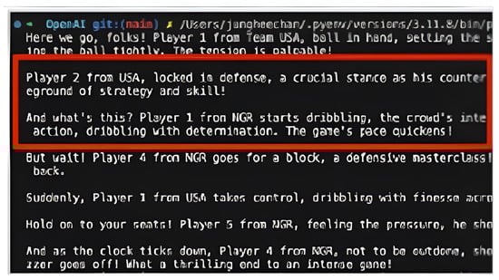 This study applied ChatGPT-4.0 Turbo API to generate according commentary for the event based on the player, team, position and action. For generation, a basic message based on player information, team information, position, and action information in Json form is generated and prompted, allowing it to be regenerated as a form of natural commentary. The example of the commentary is shown in the following Figure 4. To analyze the naturalness of the generated commentary, the extracted examples were compared with actual broadcast commentary. It was confirmed that the generated sentences were created at a level similar to actual broadcast commentary.