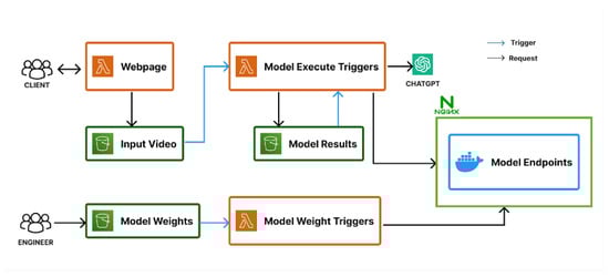 The suggested system architecture is shown on Figure 5. The system for providing AI-based broadcast commentary is structured as follows. Users upload videos, which are stored in an S3 bucket called Input Video, and view the generated commentary through a web page. The system includes another S3 bucket named Model Results for saving the results of model executions. Events triggered by storing or updating videos in the Input Video bucket or results in the Model Results bucket are detected by Model Execute Triggers, an AWS Lambda trigger, which initiates the execution of the subsequent model. Model Endpoints leverage a GPU endpoint to run the R2+1D and YOLO models, implemented using FastAPI, and are proxied through Nginx to manage access to each model’s endpoint. The Model Weights component consists of an S3 bucket that stores the fine-tuned model weights after training. When the weights are updated, Model Weight Triggers, implemented as an AWS Lambda function, automatically update the .pt file of the corresponding model locally. The system operates as follows. When a user uploads a video, it is stored in the S3 bucket, triggering a Lambda function to execute the next step in the model pipeline. Once a model completes its process, the results are stored in the S3 bucket, and the process repeats. Ultimately, the commentary results are stored in the S3 bucket and retrieved by the frontend page to display them to the user.