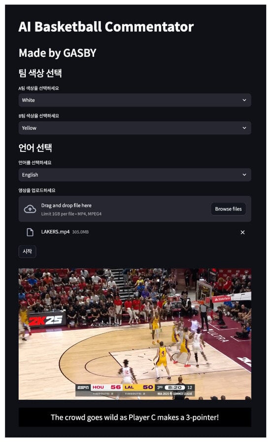 The main contributions of this study lie in addressing the gaps in sports analytics by advancing beyond mere object recognition to encompass tracking and the extraction of key events for interpreting and generating commentary for sports matches. While previous YOLO-based models have significantly improved the accuracy of ball and human detection, they have not been applied to analyze matches or generate broadcast commentary. This study proposes a method to optimize sports commentary generation by fine-tuning existing models, demonstrating the feasibility of achieving high-quality results. Additionally, recognizing the unique challenges in the sports domain—such as uncontrolled environments, complex backgrounds, inconsistent lighting, and fast-moving players—this study incorporates domain knowledge specific to basketball to distinguish between teams, players, and referees, while also recognizing in-bounds and out-of-bounds events. By implementing an algorithm tailored to these challenges, including the detection of blurry ball pixels and the differentiation of participants, this study effectively bridges the gap between object recognition and comprehensive sports game analysis, enabling robust commentary generation. Finally, through this study, it is expected that by recognizing players’ actions and play information from video input alone and automatically generating sports broadcasts, the method can be applied to less popular sports that are not currently broadcast.