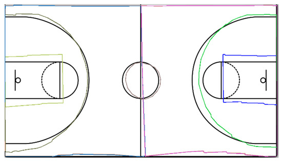 This study calculated the IoU to analyze the accuracy of the generated bird’s-eye view court image. Image labeling was performed with the LabelImg tool, consisting of the Left Court Paint Zone (Left box), Right Court Paint Zone (Right box), full court (Full Court), Left Court 3 Point Line (Left Semicircle), Right Court 3 Point Line (Right Semicircle), Left Half Court (Left Court), Right Half Court (Right Court), and Court Center Circle (Mid Circle). With the ROI (Region of Interest) coordinate, a polygon-shaped BitMask is generated, and the intersection and union of the BitMask is calculated, allowing derivation of the IoU by Function 1. The calibrated result of the court is shown on Figure 7. The colored lines are the calibrated result of the model.