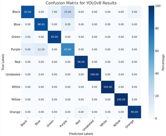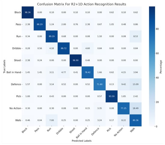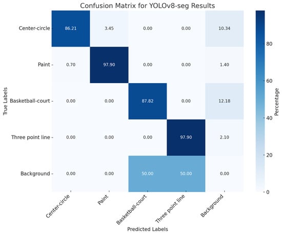 For the action recognition model, 10% of the dataset was randomly allocated as test data. The models trained with YOLO used split data from each Roboflow dataset. Specifically, for athlete recognition, 87%/6%/6% of the data were allocated for training, validation, and testing, respectively. For court segmentation, 87%/9%/4% of the data were used, and for uniform classification, 80%/13%/7% of the data were applied. The results were analyzed based on these allocations. The segmentation result is shown in Figure 8. The center circle, paint zone, basketball court, and 3-point line showed an average of 92.5% accuracy and, in particular, the segmentation result for the paint zone and 3-point line showed a high 98% accuracy, which indicates that the model showed a significant impact. For the background, our study applied an additional algorithm to recognize the non-court part as a background, so no additional accuracy calculation has been taken. Overall, excluding the background, the model performed with an average of 92.46% accuracy of court segmentation.