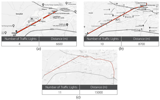 In Figure 1, Environment represents the traffic simulation environment provided by the SUMO application. At each step of the simulation environment, the observation values obtained using the Traffic Control Interface (TRACI) provided by the SUMO application were recorded in the replay memory. The observation values recorded in the replay memory consist of an array of 11 elements. A certain amount of data from the replay memory were given as input to the created network. There are 3 outputs in the output layer of the developed network. These outputs are in the form of (“Accelerate”, “Maintain speed” and “Slow down”). These actions obtained as outputs were sent back to the simulation environment and applied, and new observation values were obtained. The map used in the study pertains to the city of Elazığ and was obtained from the open-source application, Open Street Map [25]. Using the city map obtained, three different routes were established. The purpose of selecting these routes used in the study is that they have a heavy traffic flow, many traffic lights and intersections and the data to be used as input in the system are provided by the municipality. The different routes created using the map consist of a total of four lanes, two for arrival and two for departure. These three different routes were incorporated into the SUMO program using the NETEDIT program, where traffic light information was added and necessary adjustments were made to create the simulation universe. The created simulation environment was transferred to the simulation program to prepare the simulation environment [26,27,28]. The study employed the Python programming language and TRACI library [29]. All the programs used are open-source applications. In this study, three different scenarios were created to compare the performance of DRL algorithms in finding the optimum speed for vehicles in urban traffic. These algorithms were applied to these scenarios, and the results were analyzed. The routes used for the three different scenarios created for network training are shown in Figure 2.