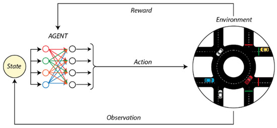 Reinforcement learning refers to the process in which an agent observes the situation in its environment, selects an action appropriate to this situation, executes the selected action and receives a reward or penalty from the environment in response to the chosen action [30]. The agent uses this feedback to perform the learning process and develops better action strategies over time. The primary goal is to create an action strategy that maximizes the total reward in the long term. Q-learning is a model-free reinforcement learning technique. It uses a trial and error approach to explore complex and stochastic environments. Q-Learning aims to create a learning process using a state–action pair with negative or positive rewards. In Q-Learning, a table is used that records the states in which the agent is located and the agent’s movements. These Q values are updated at each step. DQN, which combines reinforcement learning and deep learning, uses deep neural networks as a function approximator to find the most suitable Q-values for actions. In this study, the DQN algorithm was trained using a dataset sourced from traffic simulations and enhanced through a reward-based learning method. During training, the model learned the right acceleration or deceleration actions for various potential future scenarios by observing each step in the simulated traffic environments. However, applying the DQN model for prediction after training relies on the existing dataset. The objective here is not to predict future model features but to recommend optimal actions based on current conditions. For instance, it suggests whether to increase or maintain vehicle speed based on data like the current traffic light status and vehicle density. Thus, the DQN model is intended not as a predictive tool, but as a decision support mechanism that utilizes learned policies. The working principle of DRL is shown in Figure 3.