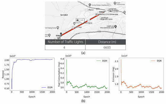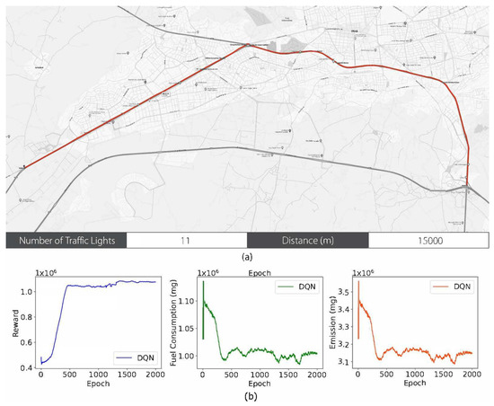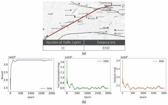 The route depicted in Figure 5 is a total of 8700 m in length and includes 10 traffic lights. Figure 5 shows that learning was successfully accomplished in alignment with the objective. The data obtained show that the average reward was maximized, while the average fuel consumption and average emission values were minimized in accordance with the desired goals. This indicates that positive results were achieved in terms of ensuring optimum speed on the determined route and reducing environmental impacts through the use of the DQN algorithm, a method of DRL. These data demonstrate the effectiveness of adjustments made on a specific route in optimizing traffic flow and reducing environmental impacts. The third route used in the study, the parameters of this route and the graph obtained from the training study conducted using this route are shown in Figure 6.