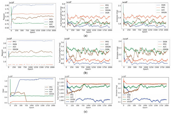 Reward, fuel consumption and emission values obtained as a result of the training. (a) First scenario. (b) Second scenario. (c) Third scenario.