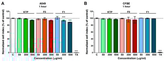 Cell viability of (A) A549 alveolar and (B) CFBE bronchial epithelial cells after 1-h treatments with KTP raw and the developed F0, F1 samples measured by impedance. Values are presented as means ± SD, n = 5–6. Statistical analysis: ANOVA followed by Dunett’s test. *** p < 0.001 compared to the control group. C, control; KTP, ketoprofen raw; TX-100, Triton X-100 detergent.