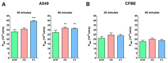 Permeability of KTP raw, F0, and F1 DPIs (50 μg/mL KTP concentration in the donor compartment) across the co-culture model of (A) alveolar epithelial cells and (B) bronchial epithelial cells after 30- and 60-min assay time. Values are presented as means ± SD, n = 4. Statistical analysis: ANOVA followed by Dunett’s test. ** p < 0.01, *** p < 0.001.