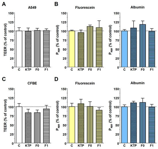 Evaluation of the tightness of the A549 alveolar and the CFBE bronchial epithelial co-culture models after the KTP raw, F0, and F1 DPIs permeability experiment by (A,C) transepithelial electrical resistance (TEER) measurement and the (B,D) permeability of fluorescein and albumin marker molecules. Values are presented as means ± SD, n = 4. Statistical analysis: ANOVA followed by Dunett’s test.