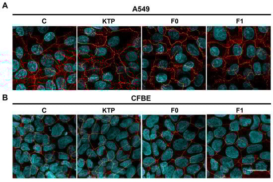 Morphological changes in the cell–cell junctions of A549 alveolar and CFBE bronchial epithelial cell layers after permeability experiments were assessed by immunostaining for β-catenin on A549 cells (Figure 4A) and zonula occludens protein-1 (ZO-1) on CFBE cells (Figure 4B). The results confirmed that KTP raw, F0, and F1 formulations did not impair barrier integrity, as evidenced by the continuous, belt-like immunostaining of β-catenin and ZO-1 at the epithelial cell borders, which was similar across all groups (Figure 4).