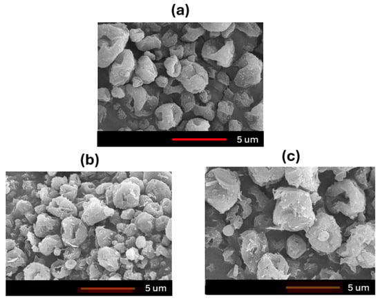 The morphology of the stored samples was analyzed using SEM to evaluate potential changes in particle structure. SEM images of the spray-dried formulation (F1) demonstrated a near-spherical morphology with a wrinkled surface (Figure 6). Spray-dried powders intended for pulmonary delivery must adhere to specific shape and size criteria to ensure effective deposition in the bronchioles or alveoli. The spherical morphology facilitates a uniform size distribution, while the wrinkled surface improves contact angles with lung tissues, enhancing aerodynamic performance []. After storage, ImageJ 1.53e software analysis indicated a slight increase in particle size (Table 2), which likely resulted from moisture absorption under humid conditions. Similar findings were corroborated by laser diffraction measurements. Despite this increase, the particle size remained below 5 µm, which is ideal for pulmonary delivery []. Additionally, SEM images of F1_3m revealed a slightly rougher surface, potentially caused by solid-state change during storage under high humidity []. This change may have led to uneven swelling or surface roughening.