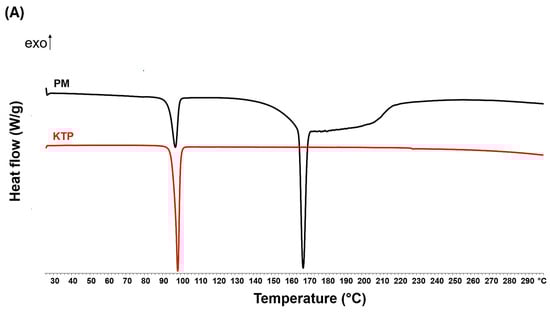 DSC was used in this study to monitor changes in the thermal stability and crystallinity of the samples over time after storage under stress conditions. The initial melting point of KTP was 97.83 °C, while in the physical mixture (PM)—comprising raw materials of KTP, stabilizers, MNT, and leucine—it was 96.50 °C (Figure 7A). In sample F1, the melting point was reduced to 91.50 °C, mostly due to the milling process. Moreover, the less intensive peaks in sample F1 compared to KTP raw indicated that some particles partially converted to amorphous after spray drying. After storage (Figure 7B), the endothermic peak’s position and intensity remained consistent, with melting points recorded at 90.84 °C after 1 month and 90.39 °C after 3 months. Overall, the DSC curves indicate that the thermal stability of the samples remained generally unchanged throughout the testing period, which is in line with previously published results [].