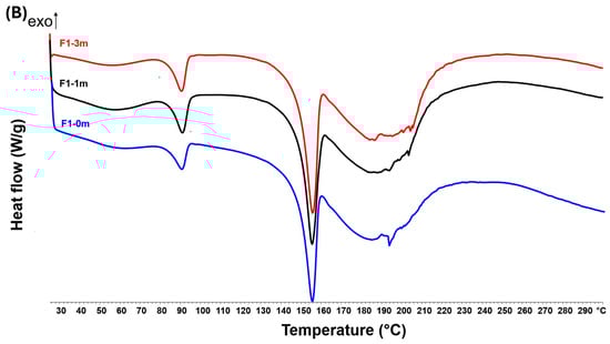 DSC thermal analysis of (A) raw ketoprofen (KTP) and the physical mixture (PM), and (B) sample F1, analyzed as a freshly prepared sample (F1—0m) and after 1 (F1—1m) and 3 (F1—3m) months of storage.