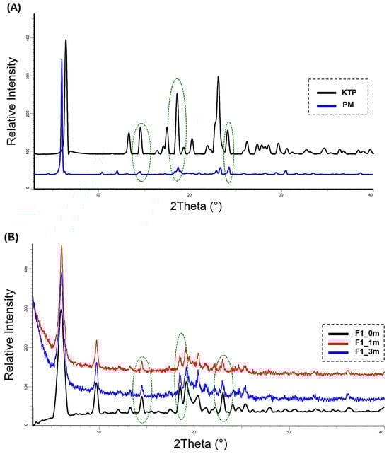 XRPD structural analysis of (A) raw ketoprofen (KTP) and the physical mixture (PM), and (B) sample F1, analyzed as a freshly prepared sample (F1—0m) and after 1 (F1—1m) and 3 (F1—3m) months of storage. The circles highlight the characteristic peaks of KTP in the raw drug, physical mixture, as well as fresh and stored formulations.
