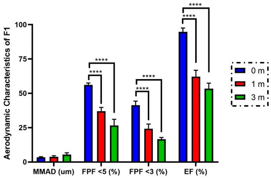 In vitro aerodynamic characteristics (MMAD, FPF, and EF) of sample F1 were analyzed as a freshly prepared sample (F1—0m), and after 1 (F1—1m) and 3 (F1—3m) months of storage, at a flow rate of 60 L/min. Data are presented as means ± SD (n = 3 independent measurements). Statistical significance is indicated, **** p < 0.0001 significantly different.