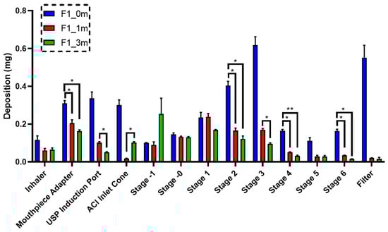 In vitro aerodynamic distribution of the F1 sample was analyzed as a freshly prepared sample (F1—0m), and after 1 (F1—1m) and 3 (F1—3m) months of storage, at a flow rate of 60 L/min. Data are presented as means ± SD (n = 3 independent measurements). Statistical significance is indicated as follows: * p < 0.05, ** p < 0.01.