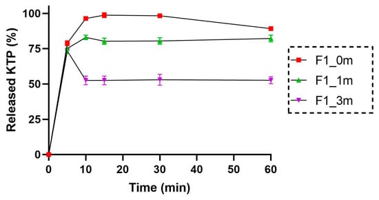 In vitro release study of raw KTP, and spray-dried sample (F1) was analyzed as a freshly prepared sample (F1—0m) and after 1 (F1—1m) and 3 (F1—3m) months of storage, in simulated lung media (SLM). Results are expressed as mean ± SD (n = 3 independent measurements).
