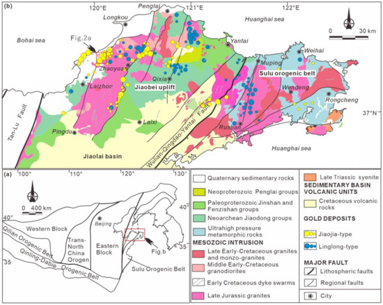 - Zhou, T.H.; Lü, Z.G. Tectonics, granitoids and mesozoic gold deposits in East Shandong, China. Ore Geol. Rev. 2000, 16, 71–90. [Google Scholar] [CrossRef]