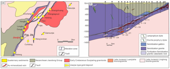 - Song, M.C.; Lin, S.Y.; Yang, L.Q.; Song, Y.X.; Ding, Z.J.; Li, J.; Li, S.Y.; Zhou, M.L. Metallogenic model of Jiaodoong Peninsula gold deposits. Miner. Depos. 2020, 39, 215–236, (In Chinese with English abstract). [Google Scholar]