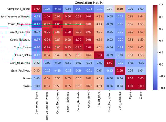 The correlation between these features is illustrated in Figure 1, which highlights the relationships between sentiment variables and Bitcoin price movements.