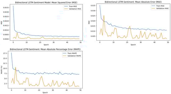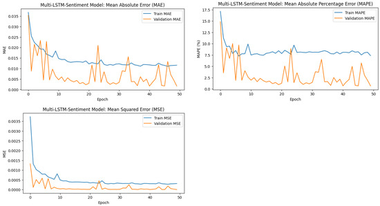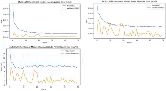 The Adam optimiser and MSE were employed to guide the training process. The training spanned 50 epochs with a batch size of 25. A validation split of 20% ensured a robust evaluation of the model’s generalisation ability. Figure 2 depicts the training and validation error trends for the Multi-LSTM-Sentiment model across MSE, MAE, and MAPE metrics, showing that the model effectively learned the training data.