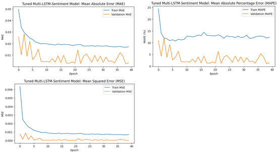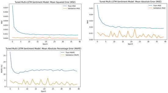 Training and validation error trends for the tuned Multi-LSTM-Sentiment model across metrics: MSE, MAE, and MAPE. Tuning resulted in a consistent reduction in errors and improved generalisation.