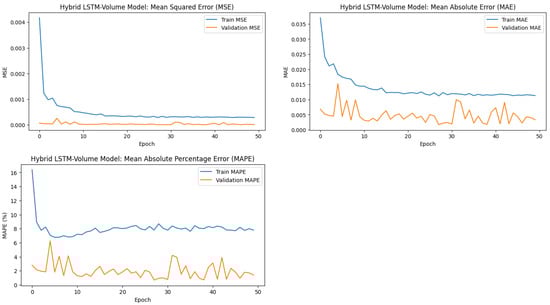 As before, the Adam optimiser was used for gradient-based learning, and the MSE was used to measure the model’s performance. The model was trained for 50 epochs, with a batch size of 25. The 20% validation split was retained, allowing the evaluation of the model’s ability to generalise to unseen data throughout training. Figure 5 presents the training and validation error trends for the Hybrid LSTM-Volume model across MSE, MAE, and MAPE metrics.