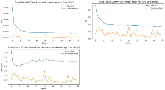 Training and validation error trends for the Hybrid LSTM-Volume model across metrics: MSE, MAE, and MAPE. The decreasing trends indicate effective learning and generalisation.