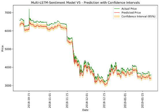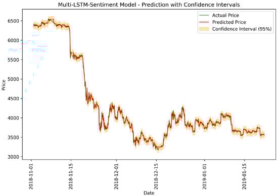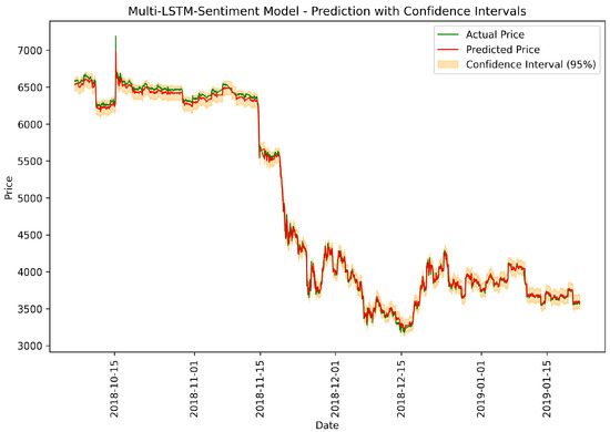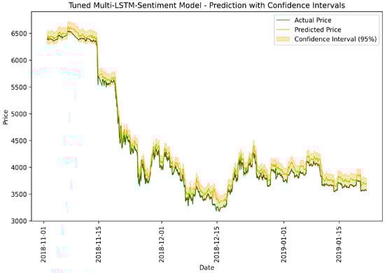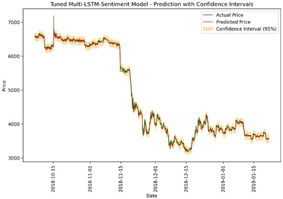 This study systematically evaluated and extended the univariate approach of Zuvela et al. [14] by developing five LSTM-based models to predict Bitcoin prices, using sentiment and tweet volume data as primary features. Among these, the tuned Multi-LSTM-Sentiment model (see Section 3.3.2) outperformed the others, achieving the lowest MAE of 0.00196 and RMSE of 0.00304, as presented in Table 2. These metrics indicate its robustness and reliability in capturing price fluctuations effectively, making it the most suitable model for the dataset.