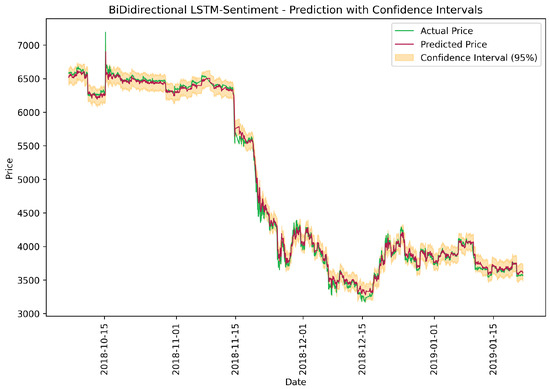 To further explore temporal dependencies, a bidirectional LSTM model, referred to as Bidirectional LSTM-Sentiment, was developed using the same input features: Bitcoin price and sentiment scores. The bidirectional LSTM architecture incorporated three bidirectional LSTM layers, each containing 50 neurons.