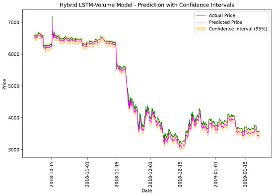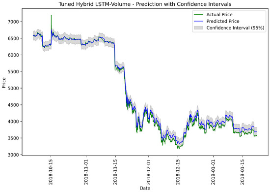 The tuned Hybrid LSTM-Volume model outperformed its base counterpart, achieving an MAE of 0.00420 and an RMSE of 0.00545. Figure 11 illustrates the model’s predictions compared to the actual prices, demonstrating significant accuracy improvements. The reduced MAE and RMSE values highlight the improvements gained through hyperparameter tuning.