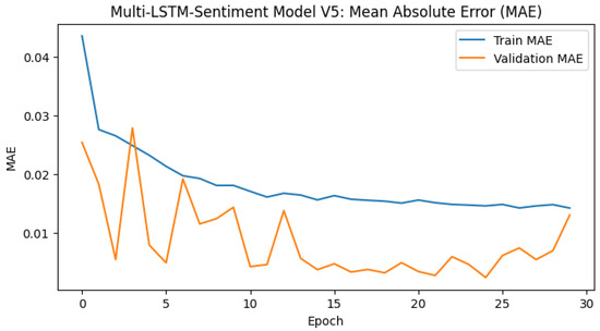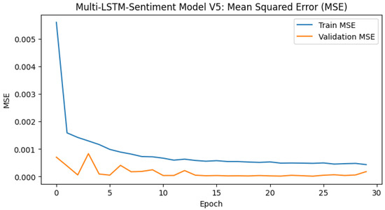 The Multi-LSTM-Sentiment model was further evaluated using an alternative data partitioning strategy of 70%–15%–15%, as discussed in Section 3.2. The results are depicted in Figure 12 and Figure 13. The model demonstrated strong robustness, as reflected in its low and stable validation MSE, rapid convergence, and consistent performance between training and validation datasets. While minor fluctuations in validation MAE and MAPE occurred, the overall trends indicated effective learning, strong generalisation, and high predictive accuracy. These characteristics suggest the model is well suited for handling unseen data, though further tuning could improve its stability and performance.