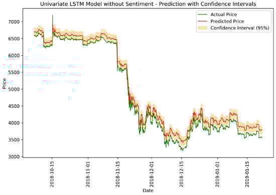 Furthermore, a univariate LSTM model trained using only the “Close” price feature was compared against the Tuned Multi-LSTM-Sentiment model (see Section 3.3.2). The results, shown in Table 6, demonstrate that the multivariate approach significantly outperformed the univariate model in all evaluation metrics, underscoring the importance of incorporating sentiment data. The actual vs. predicted prices for the univariate model are visualised in Figure 19.